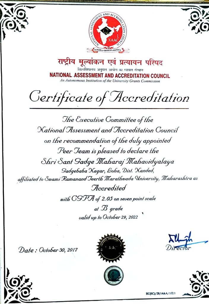 NAAC Grade CGPA-B, CGPA-2.0, Affiliated to Swami Ramanand Teerth Marathwada University, Nanded